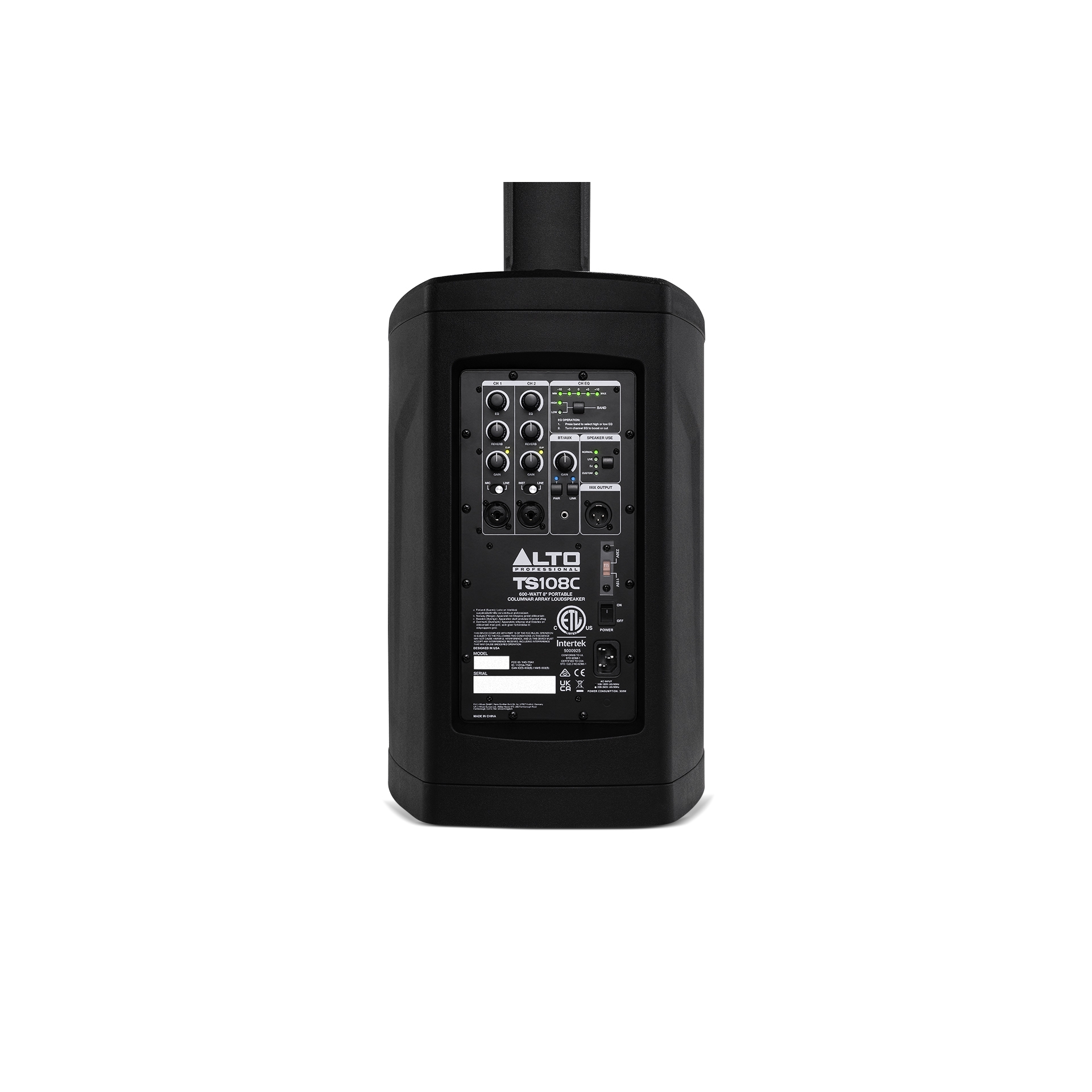 Alto Professional TS108C, 600 W tepe gücüne sahip kompakt bir column (sütun) PA sistemidir. Entegre 8″ subwoofer ve 6 adet 2,75″ sürücüyle geniş kapsama alanı sağlar (120° × 30°). Üç kanallı dijital mikser, XLR / TRS combo girişler, 2 bant EQ ve reverb ile birlikte gelir. Bluetooth bağlantısıyla kablosuz akış imkânı sunar ve Alto Pro uygulamasıyla DSP ayarlarını uzaktan kontrol edebilirsiniz. Kolay kurulumu ve taşınabilir tasarımı sayesinde müzisyenler, DJ’ler ve mobil performans ortamları için ideal bir çözümdür.