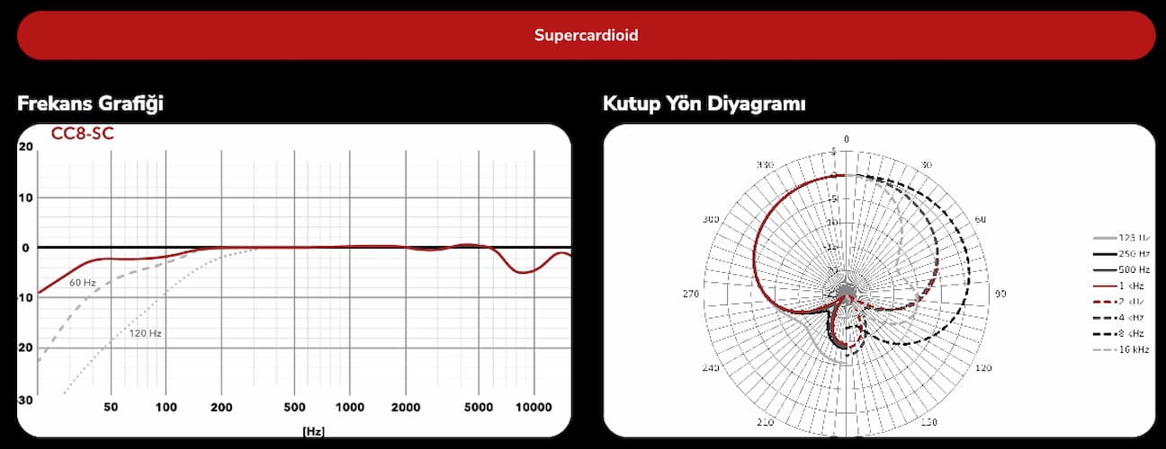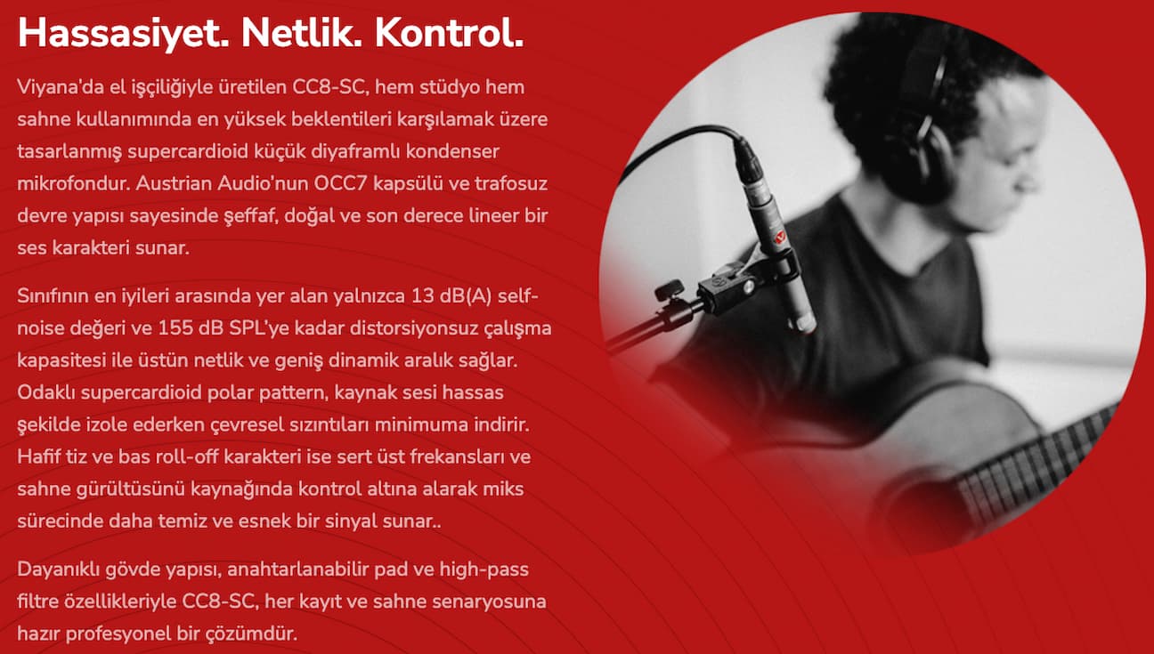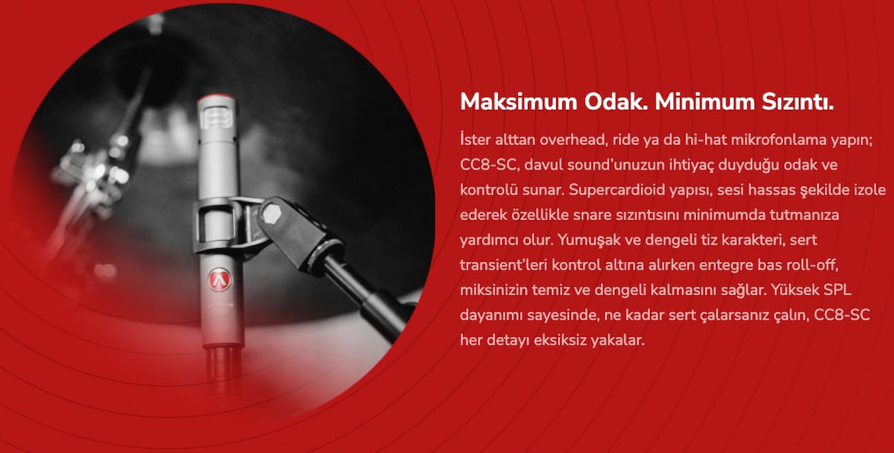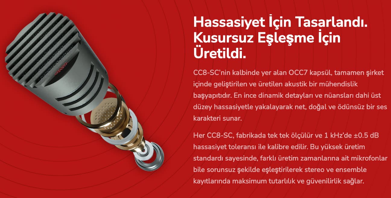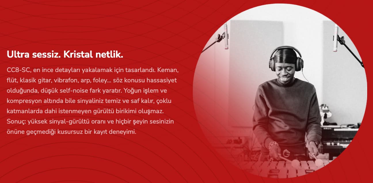 CC8-SC, özellikle hi-hat, overhead, akustik gitar, piyano ve orkestral enstrüman kayıtlarında yüksek çözünürlük ve yönlülük sunan, modern stüdyo ve sahne ihtiyaçlarına yönelik güçlü bir condenser mikrofon çözümüdür.