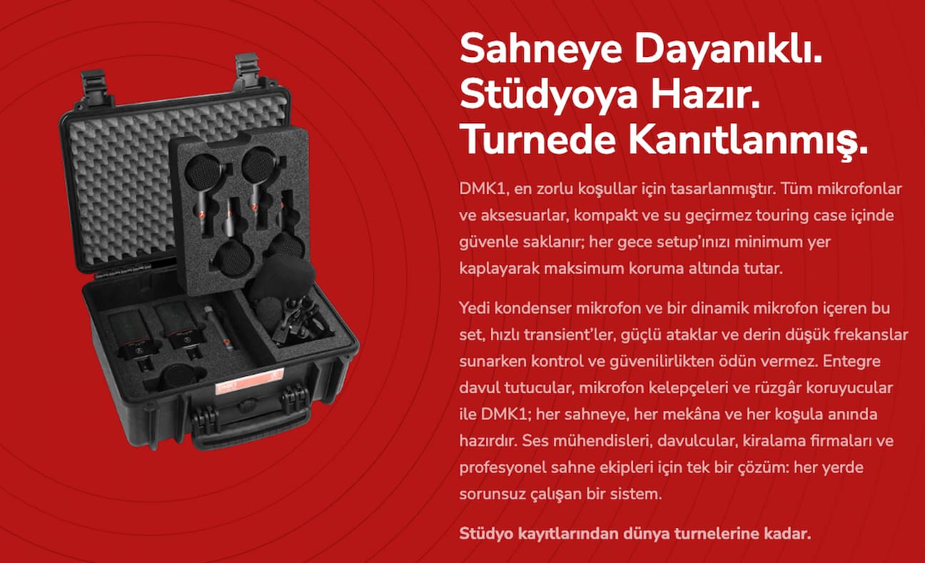 Profesyonel kullanım düşünülerek tasarlanan DMK1, beraberinde gelen davul klipsleri, mikrofon tutucular ve dayanıklı taşıma çantası ile hızlı kurulum ve güvenli kullanım imkanı sunar. Kompakt ve sağlam yapısı sayesinde sahne, stüdyo ve turne koşullarında sorunsuz şekilde kullanılabilir.