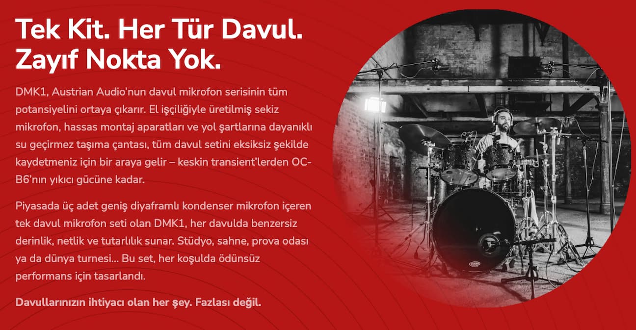 Austrian Audio DMK1, davul setlerinin tamamını tek bir sistemle profesyonel seviyede kaydetmek için tasarlanmış üst düzey bir mikrofon kitidir. İçerisinde yer alan 8 adet mikrofon ve özel aksesuarları ile kick, snare, tom, hi-hat ve overhead dahil tüm davul bileşenlerini dengeli, detaylı ve güçlü bir şekilde yakalar. Stüdyo ve sahne kullanımı için optimize edilen bu set, tutarlı ton karakteri ve yüksek çözünürlüklü kayıt performansı ile öne çıkar.