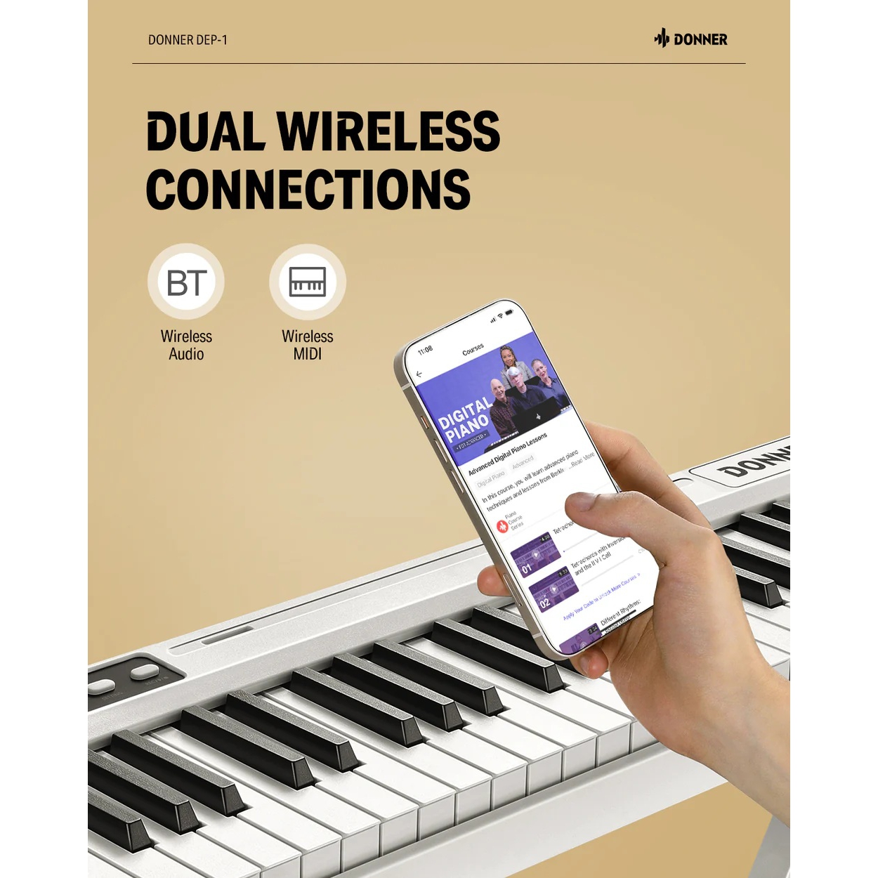 Donner DEP‑1, 88 tuşlu tam boy taşınabilir bir dijital piyanodur. Donner DEP‑1, gelişmiş çalma dinamiği, zengin ses içeriği ve taşınabilirlik özelliklerini başarılı bir şekilde harmanlar. USB‑C ve Bluetooth desteği, modern öğrenim uygulamalarıyla entegrasyonu sağlar; kayıt özelliği, çalım becerilerinizi geliştirmede etkilidir. Hafif yapısı ve taşıma çantası sayesinde ortamdan bağımsız kullanım imkanı verir.