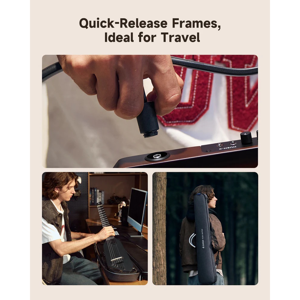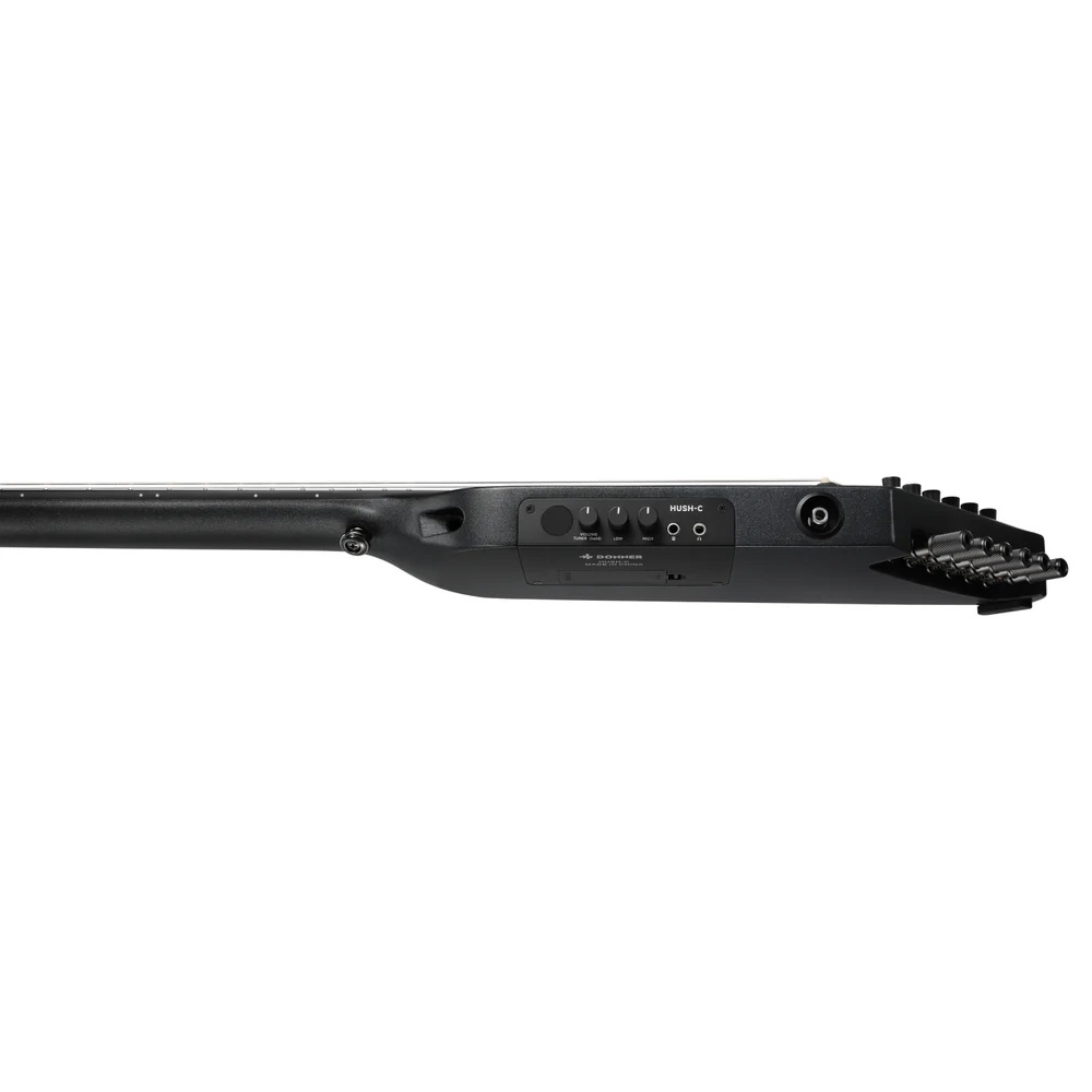 Donner HUSH‑C, silent çalım özellikli bir headless siyah klasik seyahat gitarıdır. Yaklaşık 2 kg ağırlığında hafif, kompakt ve her ortamda çalmaya uygun bir tasarıma sahiptir. Fender ölçüsünde (648 mm / 25.5″) gövde ve 46 mm C-profil sapı ile hem yeni başlayanlara hem profesyonellere konforlu bir çalma deneyimi sağlar.