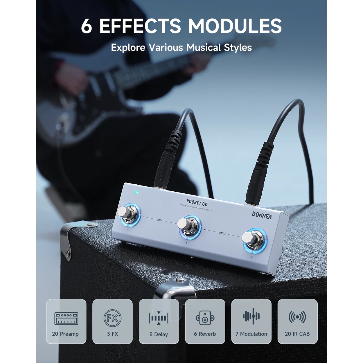 Donner Pocket Go prova, ev çalışması ve mobil kayıt senaryoları için tasarlanmış cep boyutunda bir multi-efekt çözümüdür. Tek bir pedalda 20 amfi modelleme, çoklu efekt modülleri ve 20 kabin simülasyonu (IR) sunarak, clean’den high-gain’e kadar geniş bir ton aralığına hızlıca ulaşmanızı sağlar.