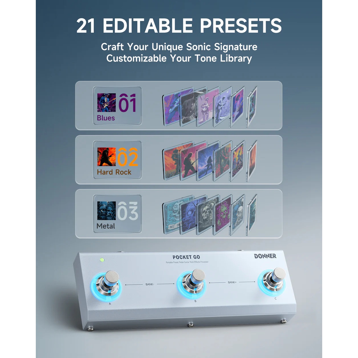 Pedal, 21 preset ile gelir ve preset’ler düzenlenip üzerine yazılabilir; ayrıca efekt zincirinde 6+1 slot aynı anda kullanılabilir ve efekt sırası kişiselleştirilebilir. Bluetooth üzerinden uygulama ile kontrol, dahili akort cihazı, kulaklık çıkışı ve OTG/USB audio desteği sayesinde “mini pedal + mobil stüdyo” mantığıyla çalışır.