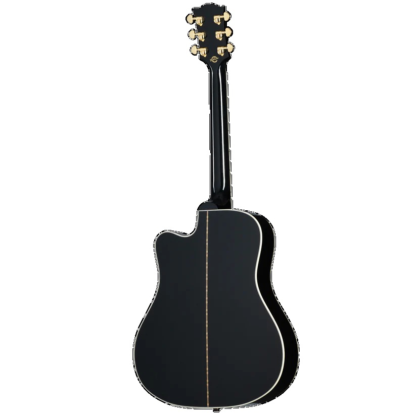 Songwriter EC Custom; masif Sitka ladin kapak, masif gülağacı arka/yanlar ve geleneksel elde oyulmuş X bracing ile zengin, dengeli ve yüksek projeksiyonlu bir ton verir. Siyah nitroselüloz finisaj, çok kat bağlama (multi-ply), Les Paul Custom esintili kafa formu ve sedef “Custom Block” klavye işaretleri sahnede seçkin bir görünüm sunar. L.R. Baggs Session VTC sistemi (soundhole volume & tone) kutudan çıkar çıkmaz profesyonel bir elektro-akustik performans sağlar. Altın Grover Rotomatic burgular ve sert kılıf dahildir.