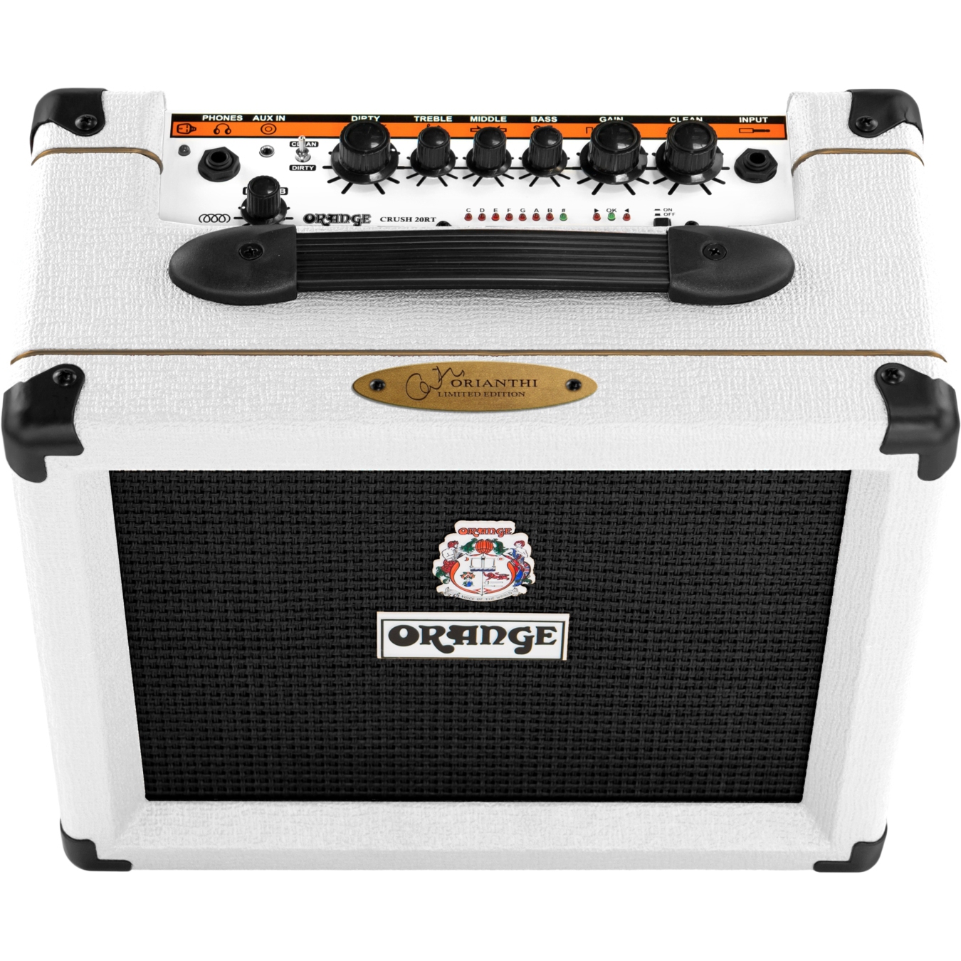 Orange CRUSH 20RT Orianthi Limited Edition ile dikkatleri üzerinize çekin ve sesi yükseltin! Şık beyaz Tolex ve tamamen siyah detaylarla donatılmış bu amfi, ikonik stili ve çok yönlü sesi bir araya getiriyor.