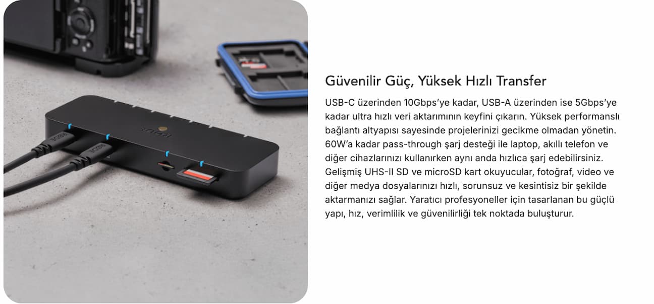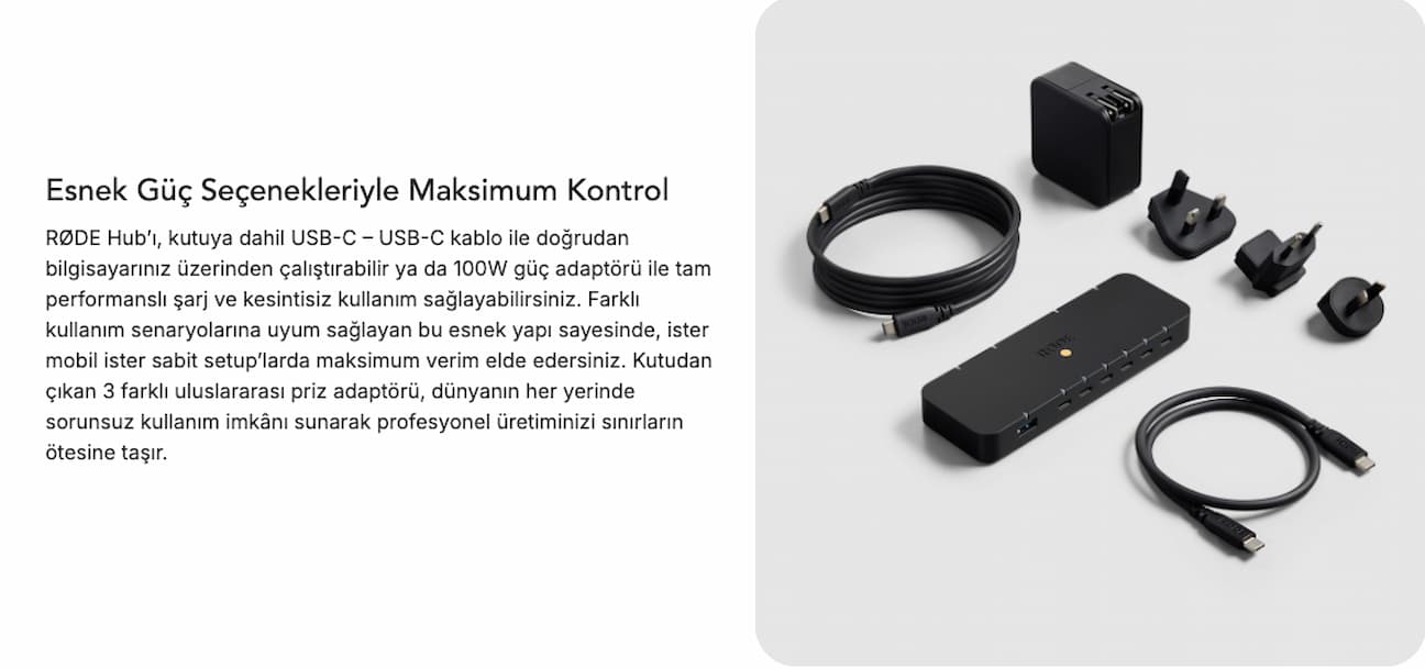 RØDE Hub, yüksek hız, güçlü bağlantı ve stabil enerji yönetimini tek bir cihazda birleştirerek profesyonel çalışma alanınızı sadeleştirir. Tüm ekipmanlarınızı tek noktadan yönetmek isteyen kullanıcılar için güçlü ve güvenilir bir çözüm sunar.