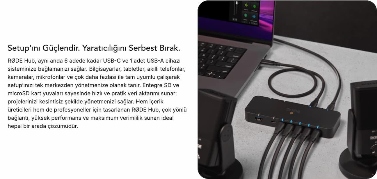 RØDE Hub, modern prodüksiyon ve içerik üretim setup’ları için tasarlanmış yüksek performanslı bir USB-C hub çözümüdür. Tek bir merkezden birden fazla cihazı bağlamanıza, yüksek hızda veri transferi yapmanıza ve cihazlarınızı aynı anda şarj etmenize olanak tanır. Stüdyo, video prodüksiyon ve müzik üretimi için ideal bir masaüstü kontrol noktasıdır.