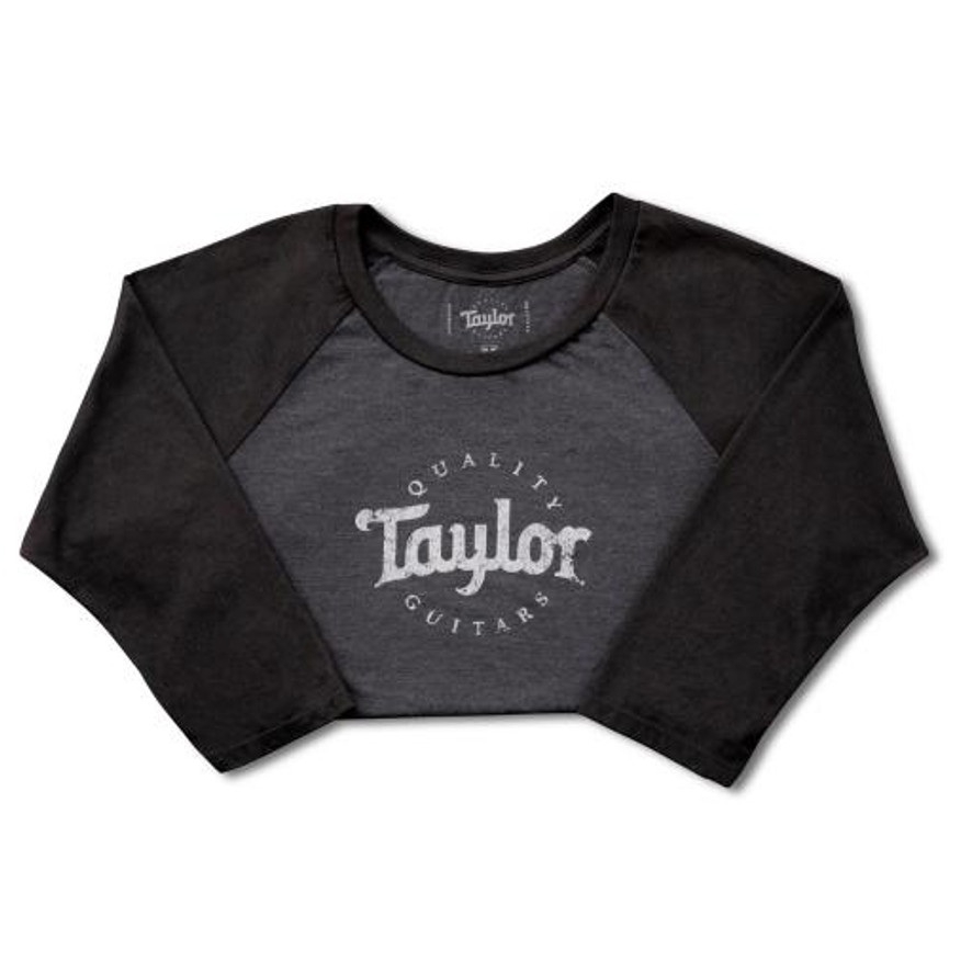 Çift siyah renk şemasına sahip kadın beyzbol tarzı tişört, göğüs kısmında eskitilmiş Taylor Guitars logosu bulunur. Dar kesim, 3/4 uzunlukta kollu. Bir beden büyük seçilmesi önerilir.